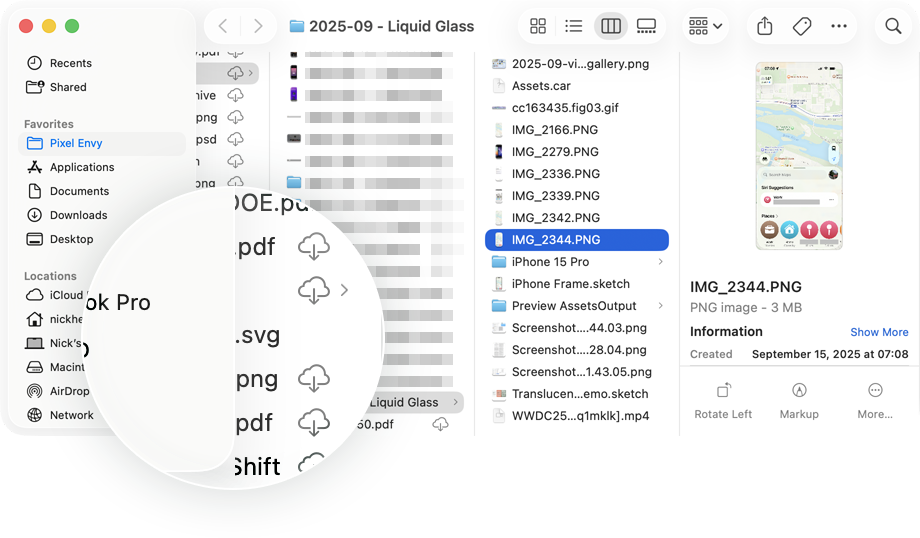 I expected Apple to justify this on the basis that it maintains context or something, but it does not. Its Human Interface Guidelines only say this is done to “reinforce the separation and floating appearance of the sidebar”, though this is not applied consistently. In a column view in Finder, for example, there is a hard vertical edge below the rounded corner of the ostensibly floating sidebar. I am sure there are legibility reasons to do this but, again, it is a solution to a problem Apple created. It reimagined sidebars as a floating thing because it looks cool, then realized it does not work so well with the best Finder layout and built a fairly unrefined workaround.