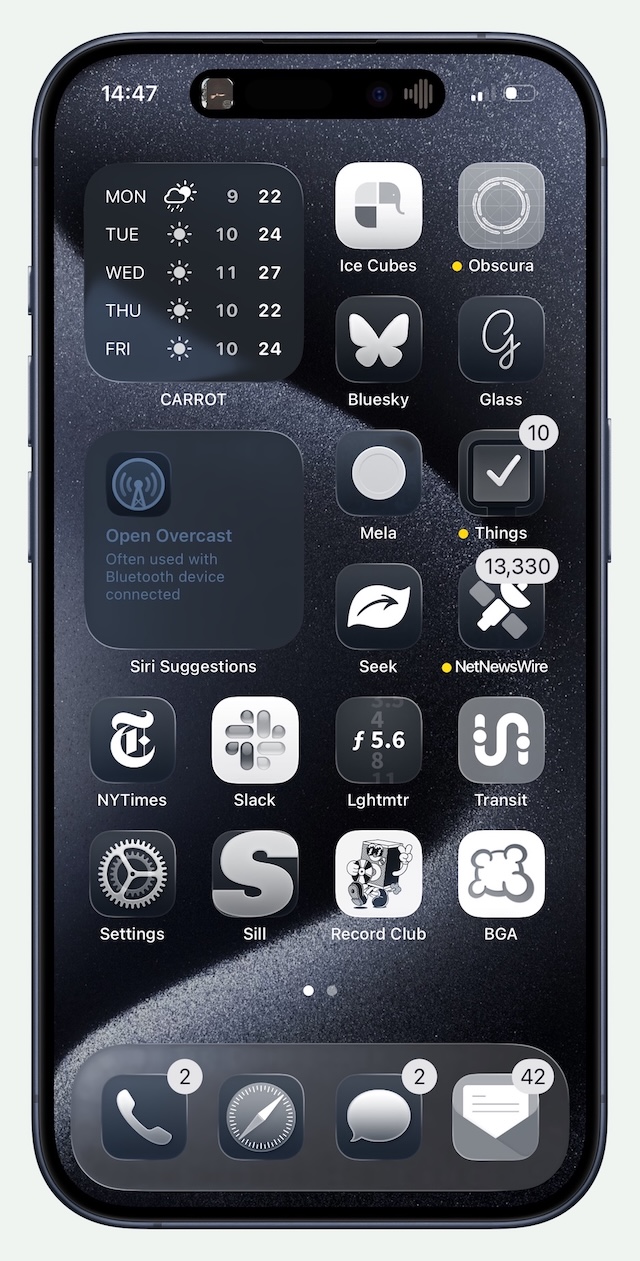 If these icons have an advantage, it is that Apple is now allowing more user customization than ever. In addition to light and dark modes, application icons can now be displayed in clear and tinted states. Designers can specify new icons, and iOS will automatically convert icons without an update with mixed results. And, as with the other icon display modes, this also affects widgets on the Home Screen and icons across the system. Clear and tinted both look like frosted glass and have similar dimensional effects as other Liquid Glass elements, though one is — obviously — tinted. I can see this being a boon to people who use a photo as their wallpaper, though it comes at the expense of icon clarity and designer intention.