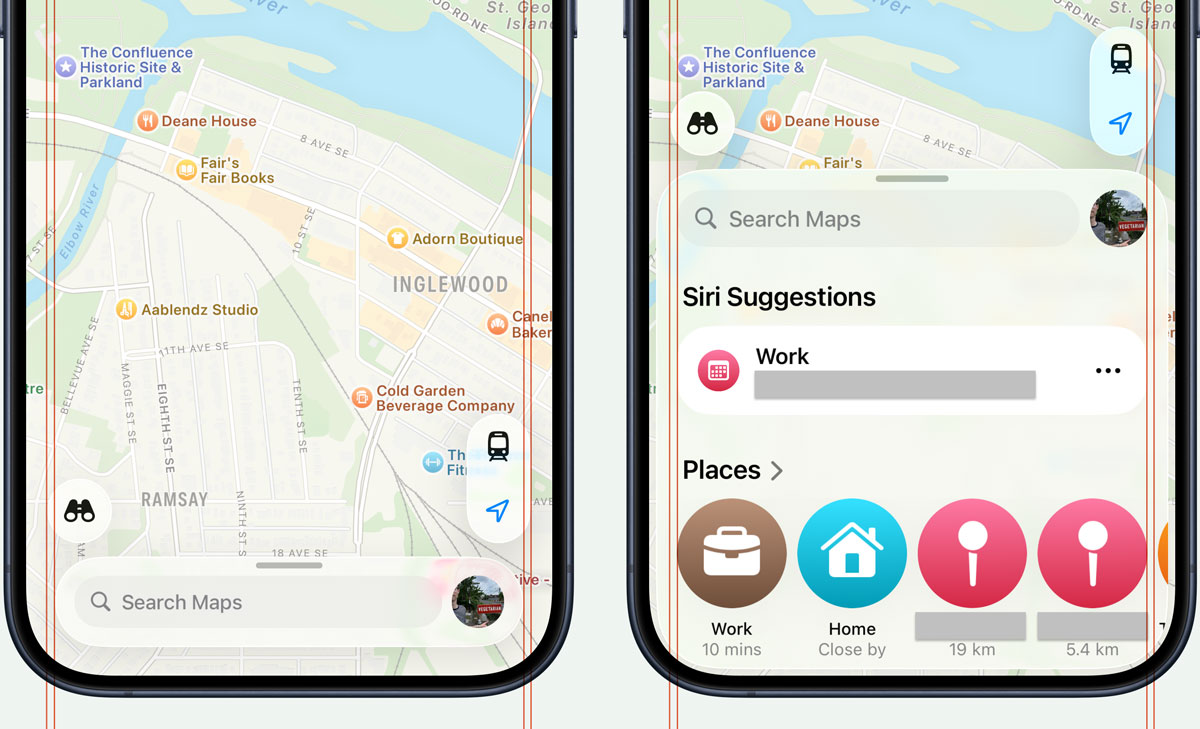 Maps on iOS has a different kind of concentricity issue. When the search area is in a retracted state, the container around the search bar does not align with the left and right edges of the buttons above it, in a way that does not feel deliberate. I assume this is because it follows the curves of the display corners with an equal distance on all sides. When it is in an expanded state, it becomes wider than the buttons above it. At least — unlike the Share sheet — its bottom corners are rounded correctly on my iPhone.