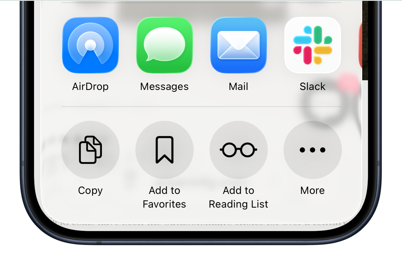 Even on a device with four rounded display corners, this dedication to concentricity is not always executed correctly. My iPhone 15 Pro, for example, has corners with a slightly smaller radius than an iPhone 16 Pro. The bottom corners of the share sheet on my device are cramped, nearly touching the edge of the display at their apex.