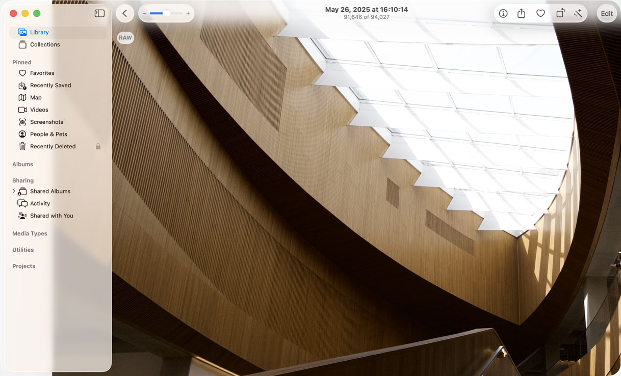 Then there are the window controls. The sidebar in an application is now depicted in a floating state which, Apple says, is “informed by the ambient environment within the app”, which means it reflects the colours of elements around it. This includes colours from outside the app which, a lot of the time, means the sidebar looks translucent to windows underneath it, which defies all logic. The sidebar reflects nearby colours even if you enable the “Reduce Transparency” setting in Accessibility settings, even though it makes the sidebar look translucent. But then the window controls are set inside this sidebar which, because it is floating, makes it look like these controls do something to the sidebar, not the application window.